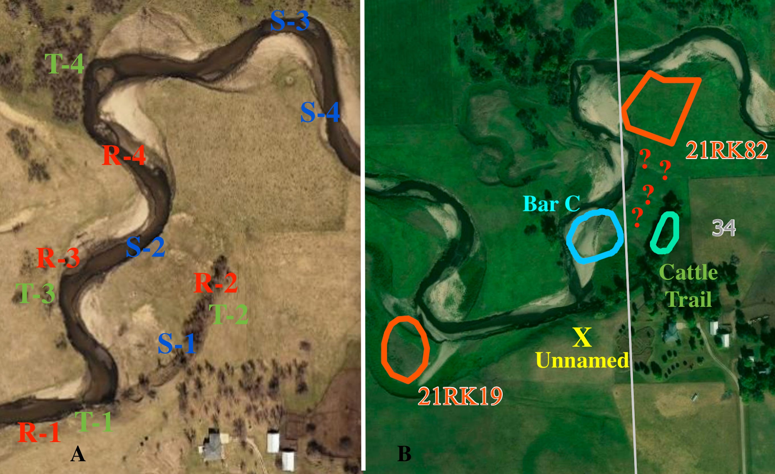 However, the current archaeological sites are mainly based on the outlined areas where artifacts have been collected from the surface or dug up in excavations or shovel tests (Figure1-B). We’re going to focus on the outlined floodplain sites called Bar C and 21RK82. Should those outlined areas be enlarged to include elements like rocks, trees, and springs? Bar C wouldn’t need to be very much larger to incorporate those additional elements. However, the area for 21RK82 would have to be substantially bigger in order to add the rocks, trees, and springs. Also, could 21RK82 possibly be expanded to the south to include Bar C because there are archaeological aspects shared between these two sites? The answer to that question is in the area between the sites marked by red “?”s.