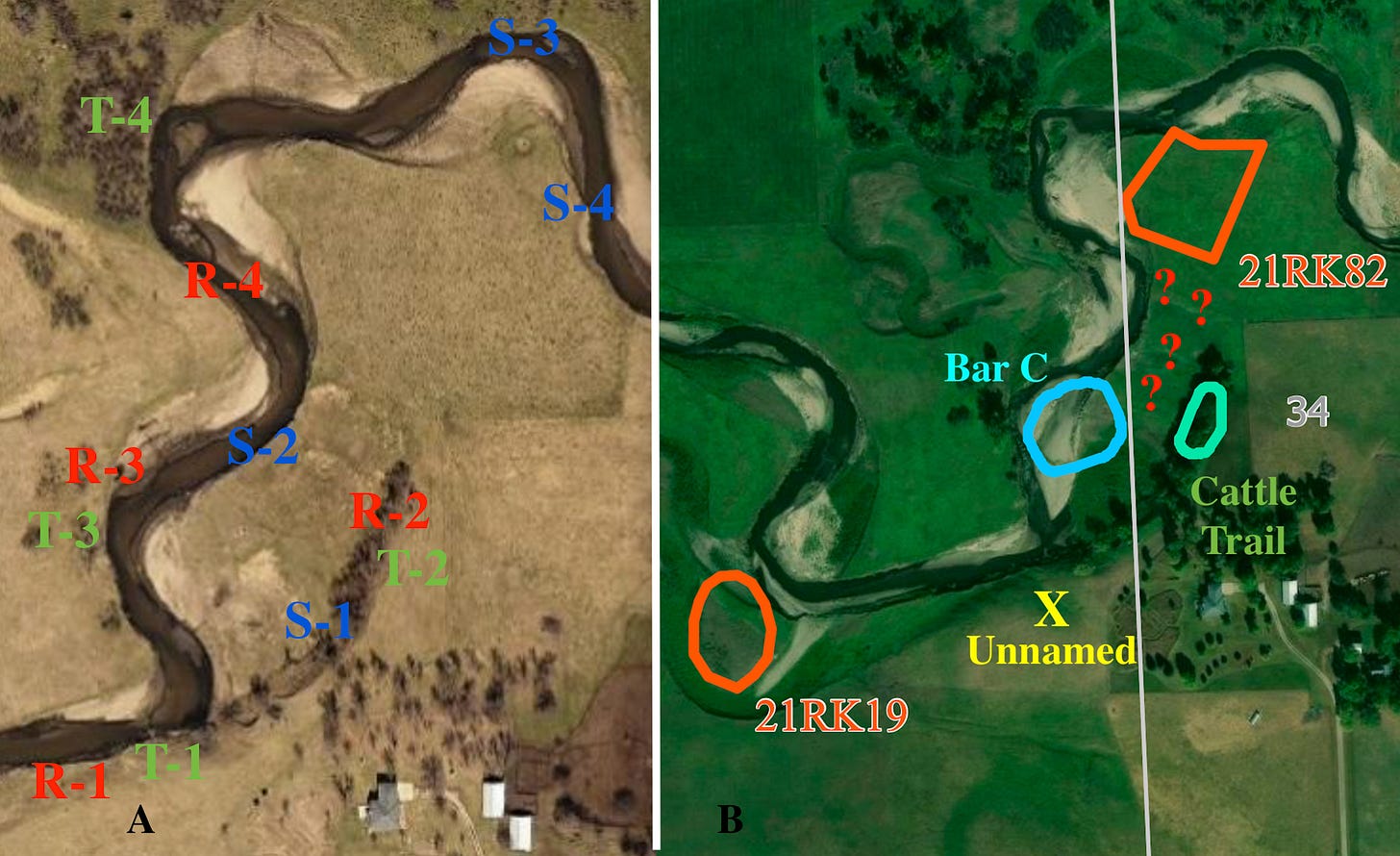 One of the most common ways for new archaeological sites to be “discovered” is for laypeople to pick up artifacts. When trained archaeologists make the “finds” the exercise is called a “pedestrian survey” and the finds are called “surface collections”. But the professionals also dig excavation units and use shovels to test smaller areas. Those collections are more significant because they are “in place” within the soil layers and have context for interpretations. One of the floodplain sites, informally called Bar C, is based mainly on surface collections made by both family members and professionals; it’ll soon be submitted for designation as a formal, numbered site. The other site already has a formal number, 21RK82, and it has also had excavations and other work done by professional archaeologists.