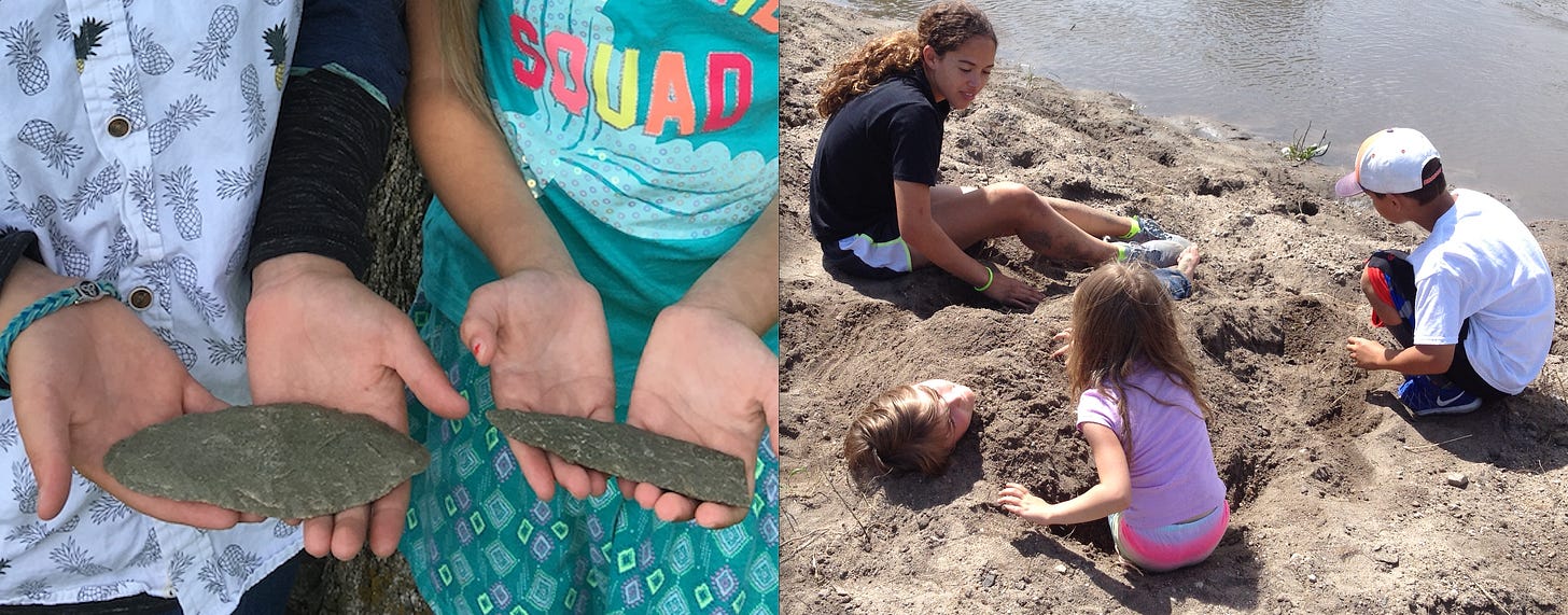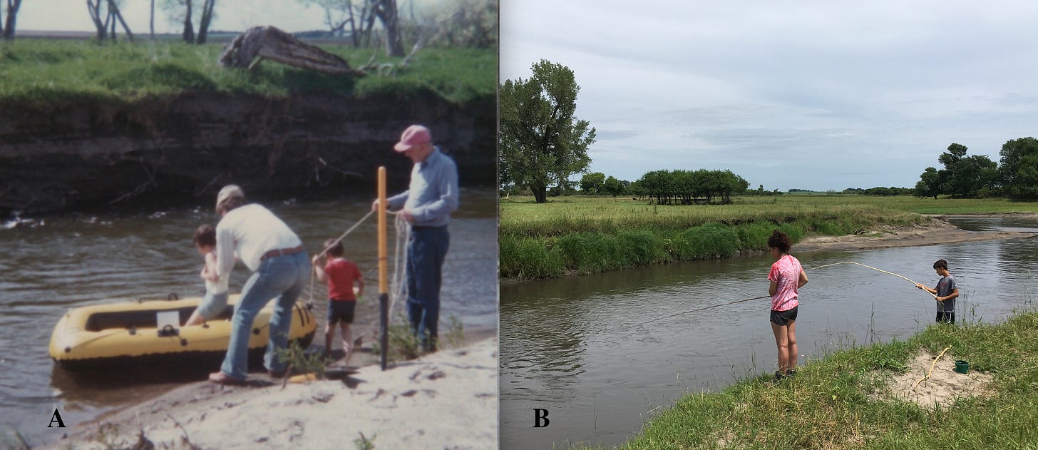 The launch of the yellow rubber raft in Figure 3-A took place on Bar C across the Creek from the rock (R-3, Figure 1-A) recently exposed by erosion. Those are my children in and beside the raft and now they both have kids in college! The two layers visible in the far bank hold the record of Native American tools and buffalo bones. My two grandkids in Figure 3-B are fishing at essentially the location of the rock where Dad was sitting (Figure 2-A) about 100 years before that. The large cottonwood tree at the left side of the photo is the possible descendent of the original Lone Tree (T-3, Figure 1-A). It also has small wild plum trees nearby. However, between the ancient memories recorded in the layers of glacial sediments and the more recent memories enshrined in photographs, there is a long history of Native American activities memorialized in the animal bones and tools found in the outlined archaeological sites (Figure 1-B).