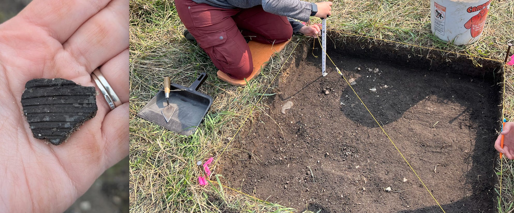 Figure 7----Scenes from the archaeologists at work in Site 21RK82. A) Piece of pottery they found along a Creek bank. B) Measuring locations within the first excavation unit that was put in.