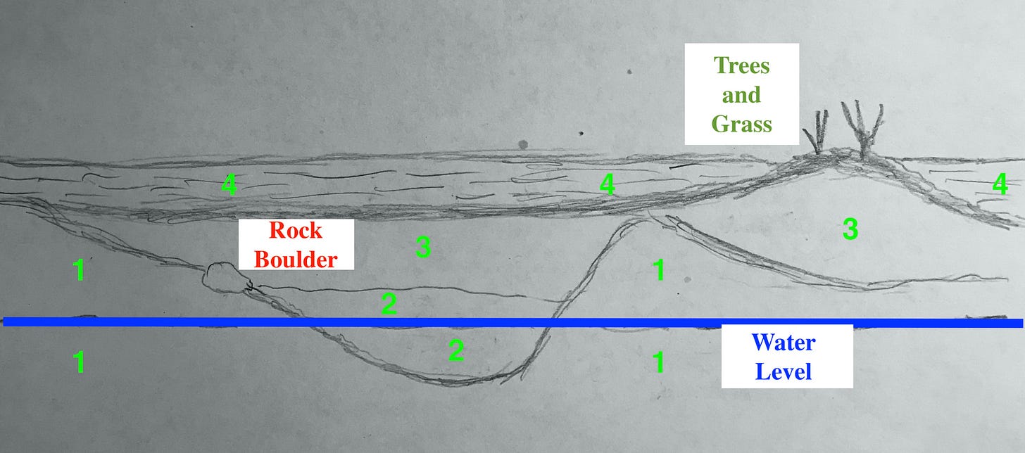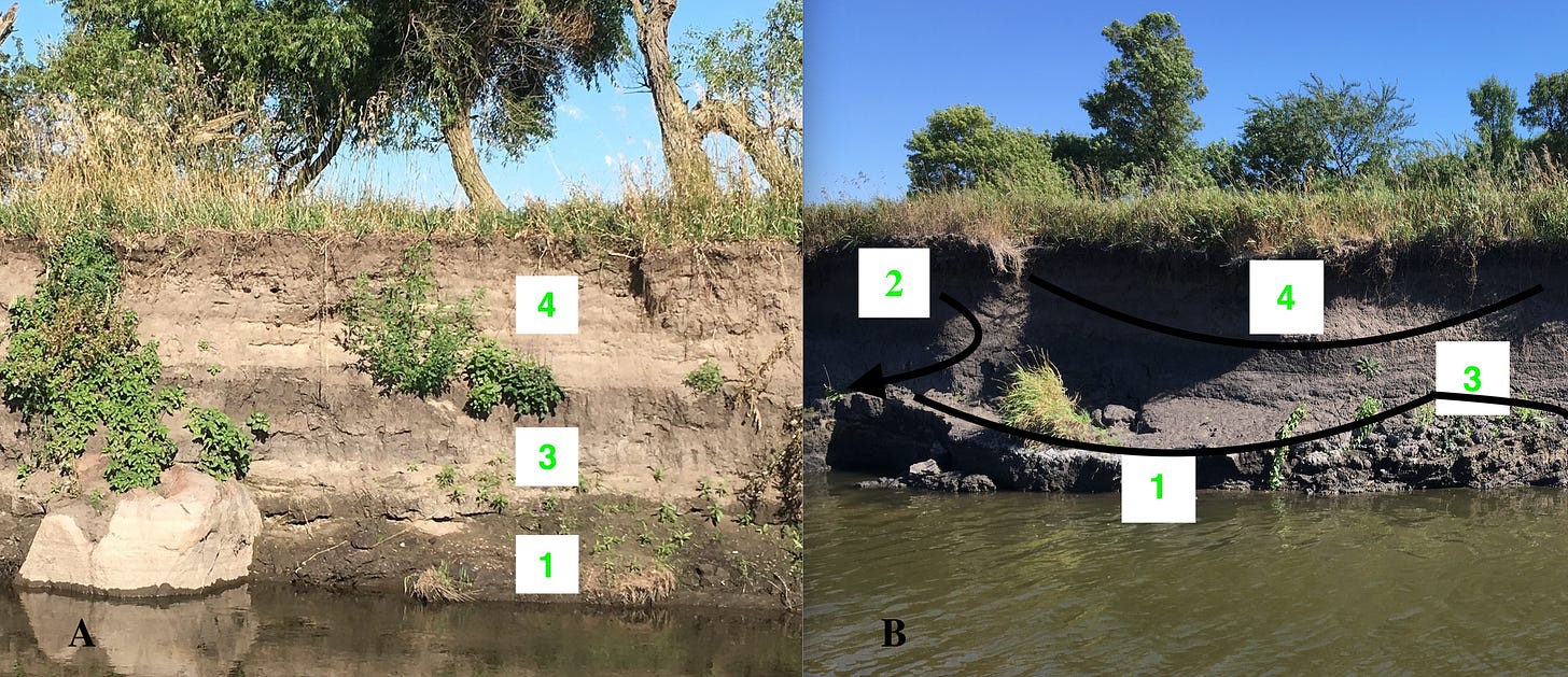Rocks, trees, and springs are associated with the two hillslope sites (Figure 1-A). A rock that’s now buried (R-1) is near the former location of the old Lone Tree (T-1) and rocks are also found at the Cattle Trail Site that has a wild plum thicket at the top of the hill (R-2 and T-2). Landslides triggered by springs (S-1) are found all along the hillslope. These springs probably flow from fractured glacial sediments, but the springs on the floodplain (S-2, S-3, and S-4) are associated with buried sand and gravel. There’s a large cottonwood tree (T-3) that we think is an offspring of the original Lone Tree and it has a rock (R-3) nearby that was only recently exposed by the channel erosion. There are also rocks within the channel just upstream (R-4) with a wild plum thicket (T-4) on the adjacent floodplain surface.