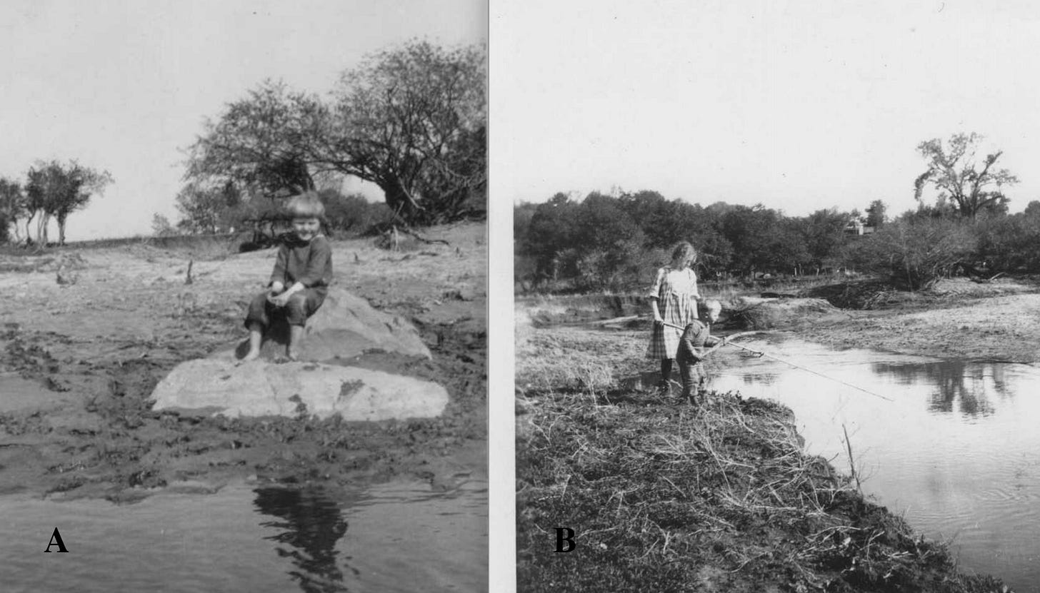 Figure 2----Two photos from the 1920s. A) My Dad on a rock (R-1, Figure 1) at the site of the old Lone Tree. B) Dad and his older sister fishing near a spring (S-2, Figure1).